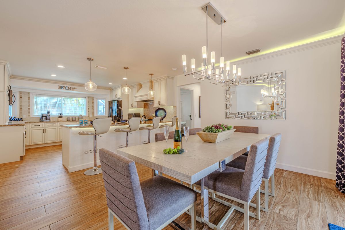The fully equipped kitchen has everything you need, including stainless appliances, coffee maker, toaster, and plenty of counter space. Enjoy meals together at the bar seating or dining area overlooking the pool.