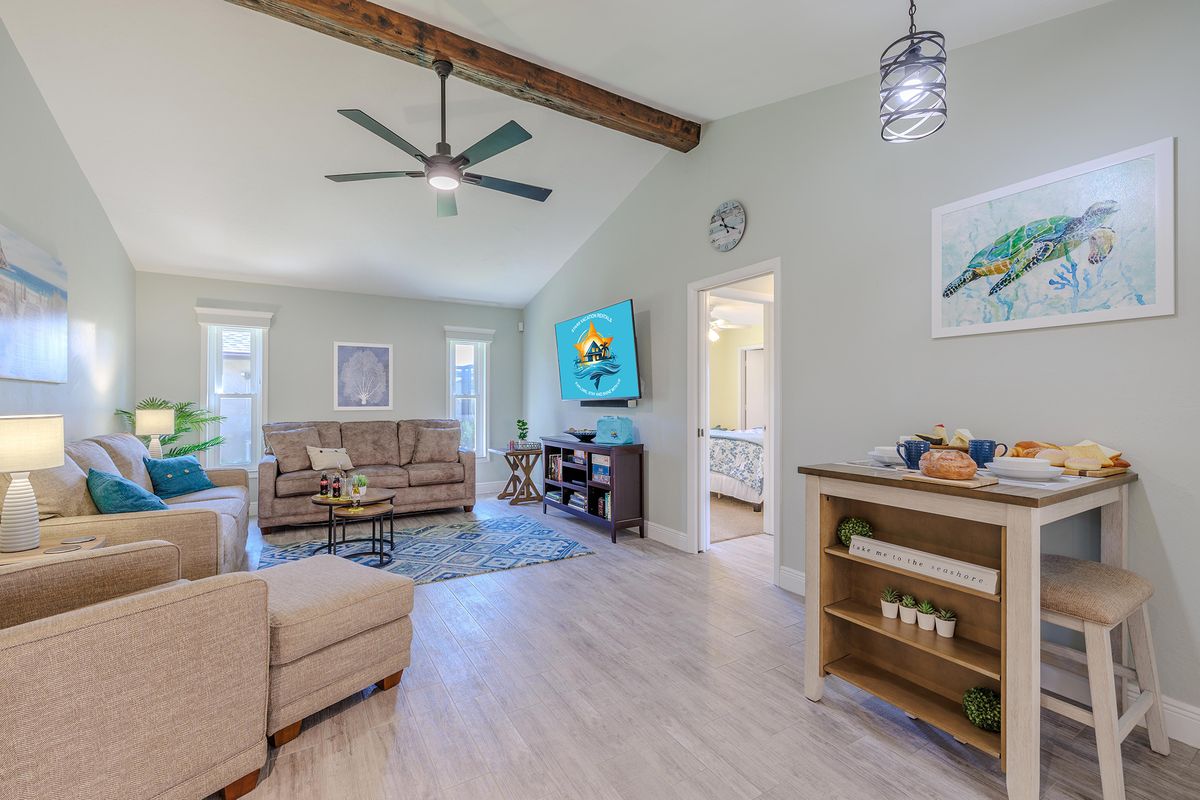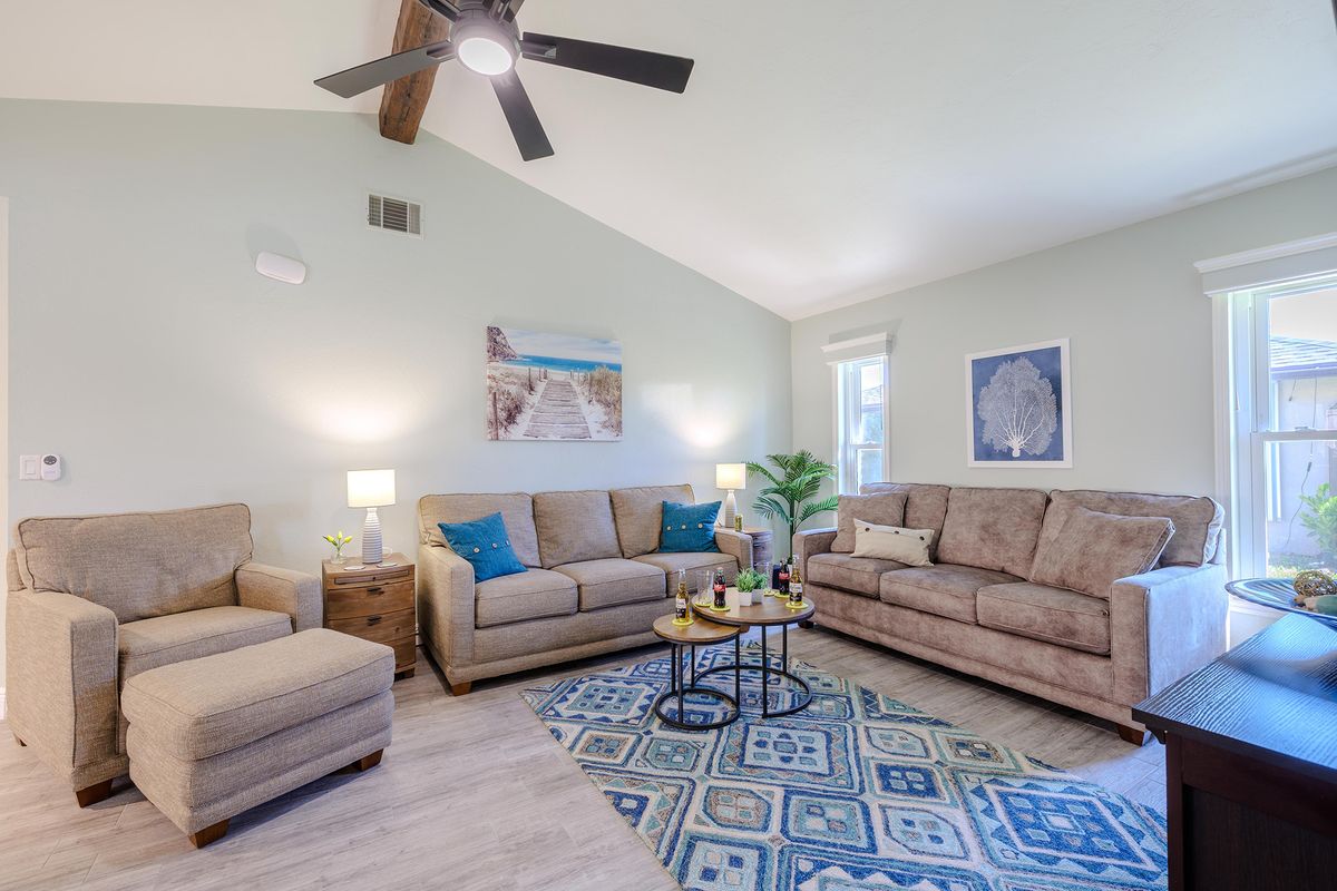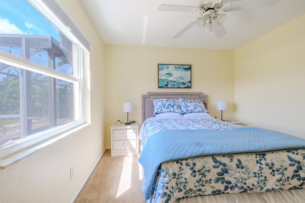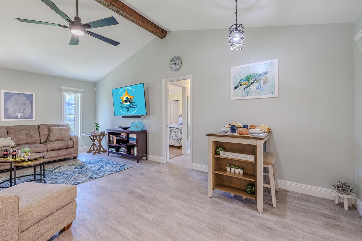 This villa is set up for both families and pet owners. Up to two small dogs (under 30 lbs) or one large dog are welcome with a pet fee. The fenced yard and nearby water access create a safe, enjoyable environment for both kids and pets.