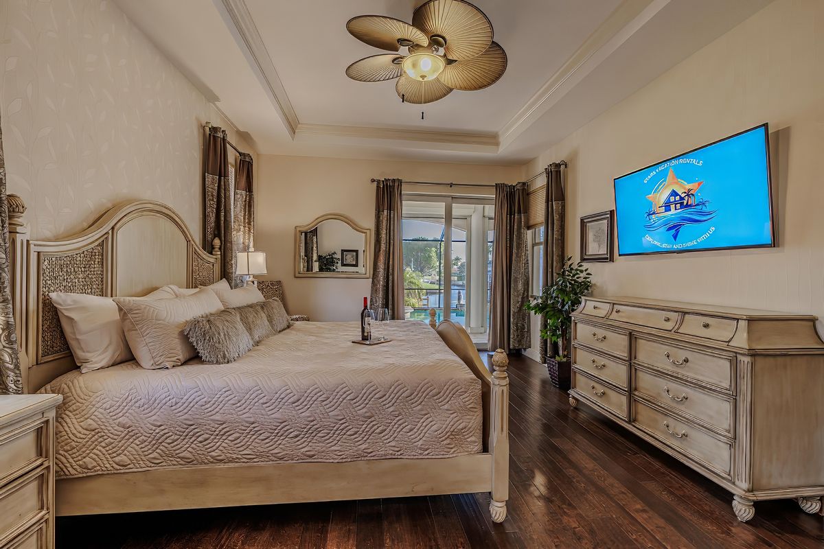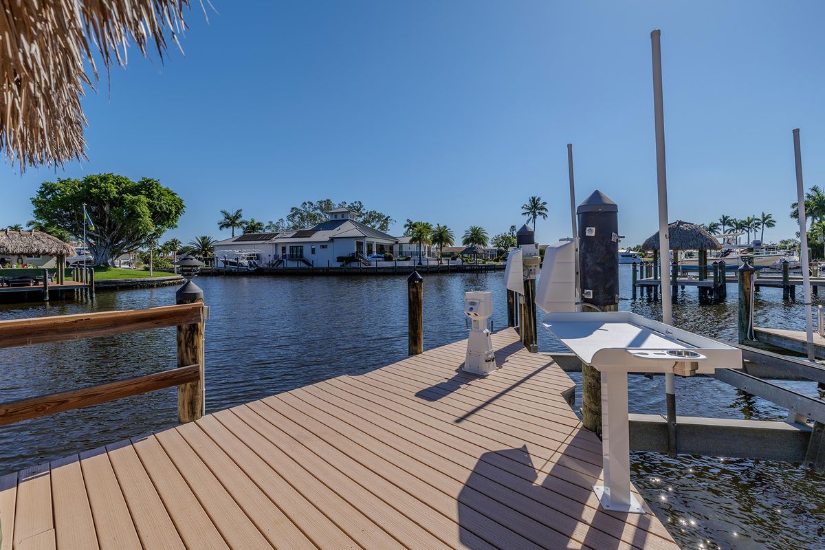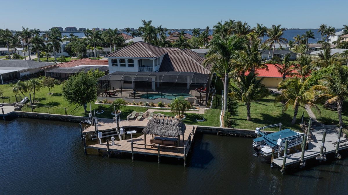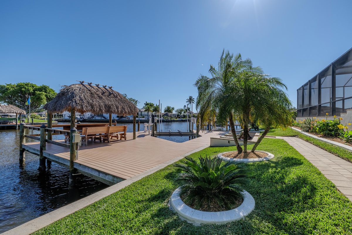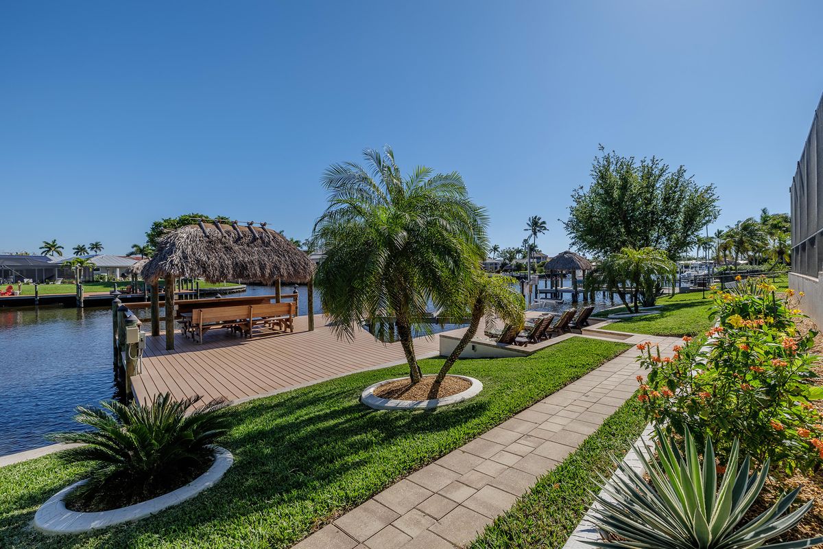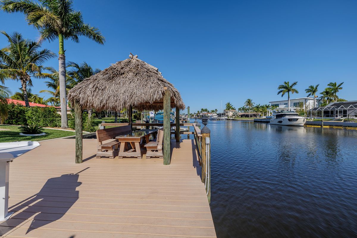 The villa's tropical backyard is made for sun-soaked days and breezy nights. Take a dip in the heated pool, sip a cocktail at the swim-up bar, or unwind in the hot tub under the stars. Fire up the BBQ for alfresco dining on the spacious patio, or retreat to the shaded Tiki bar for a laid-back evening drink. At the water's edge, your private dock offers Gulf access, fishing opportunities, and a front-row seat to Cape Coral's famous sunsets.
