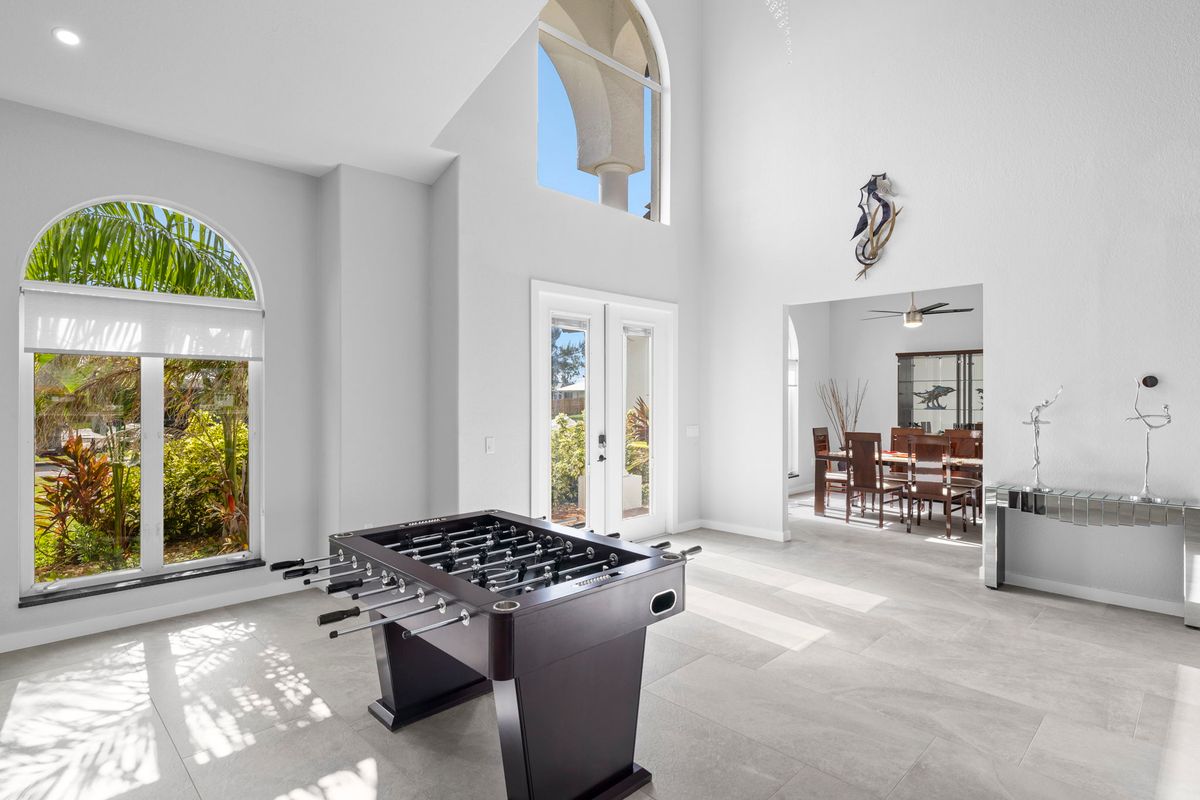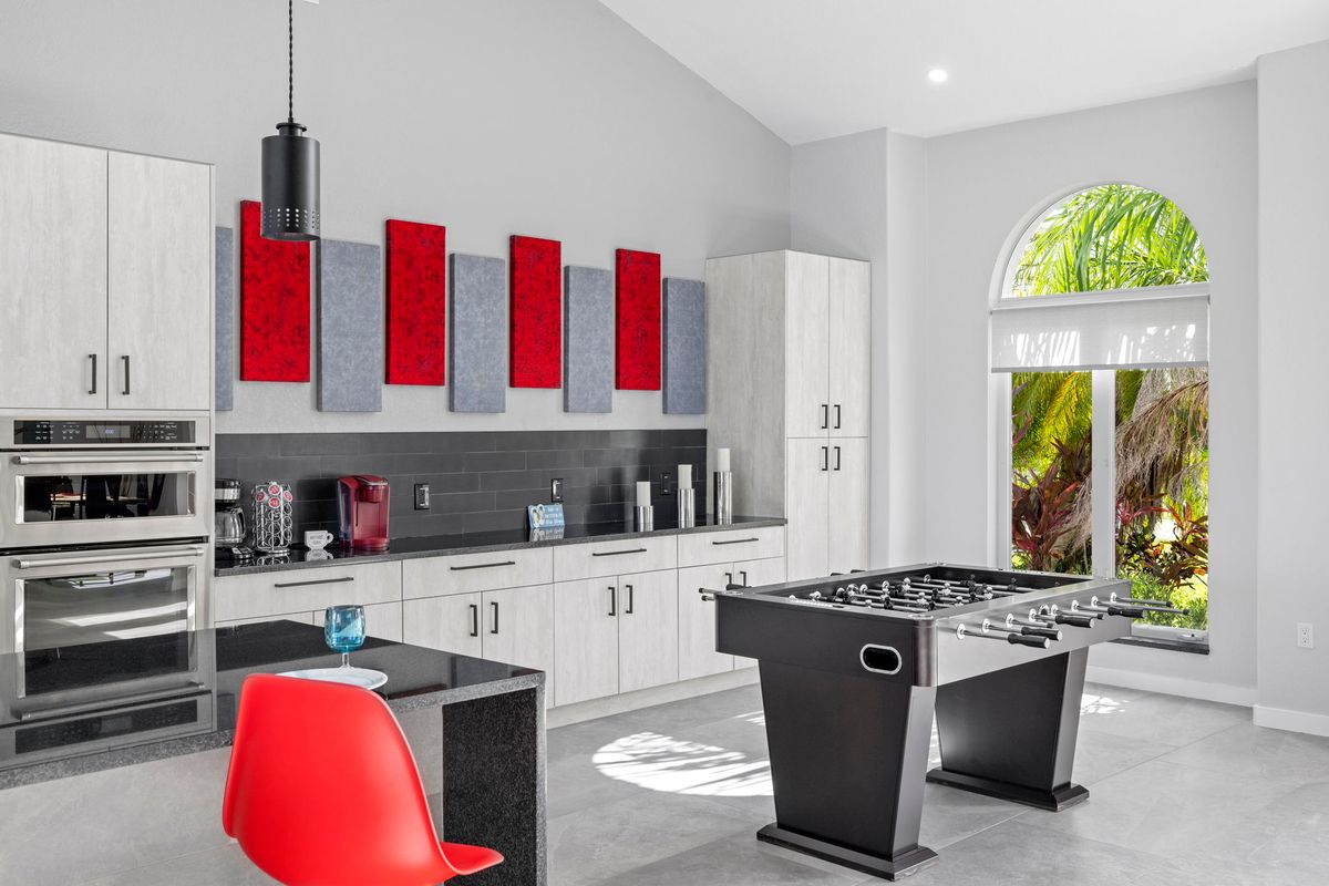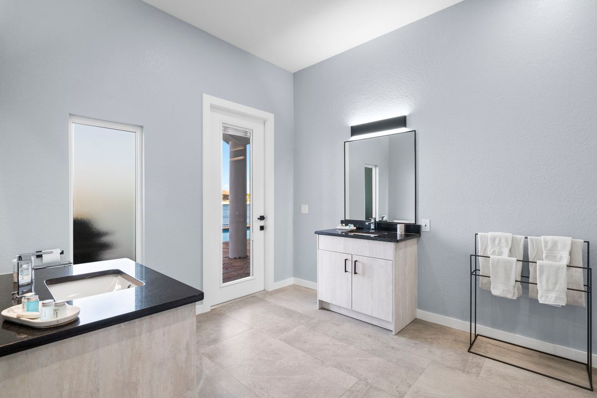 Designed with light and space in mind, the villa's open-plan interiors maximize water views. The fully equipped kitchen boasts marble countertops, modern appliances, and a large dining table that makes every meal a shared experience. After dinner, head to the garage for a friendly ping pong or foosball match, curl up with a book, or stream a movie in the living area. With air conditioning, Wi-Fi, and a washer/dryer, the home balances luxury with convenience for both short and long stays.