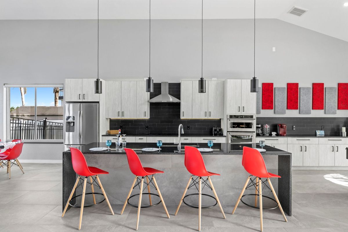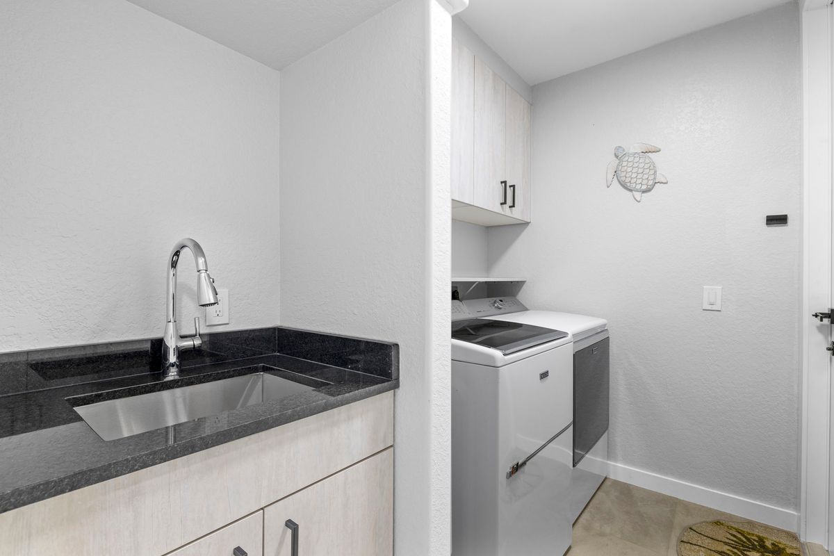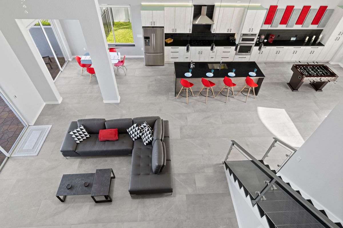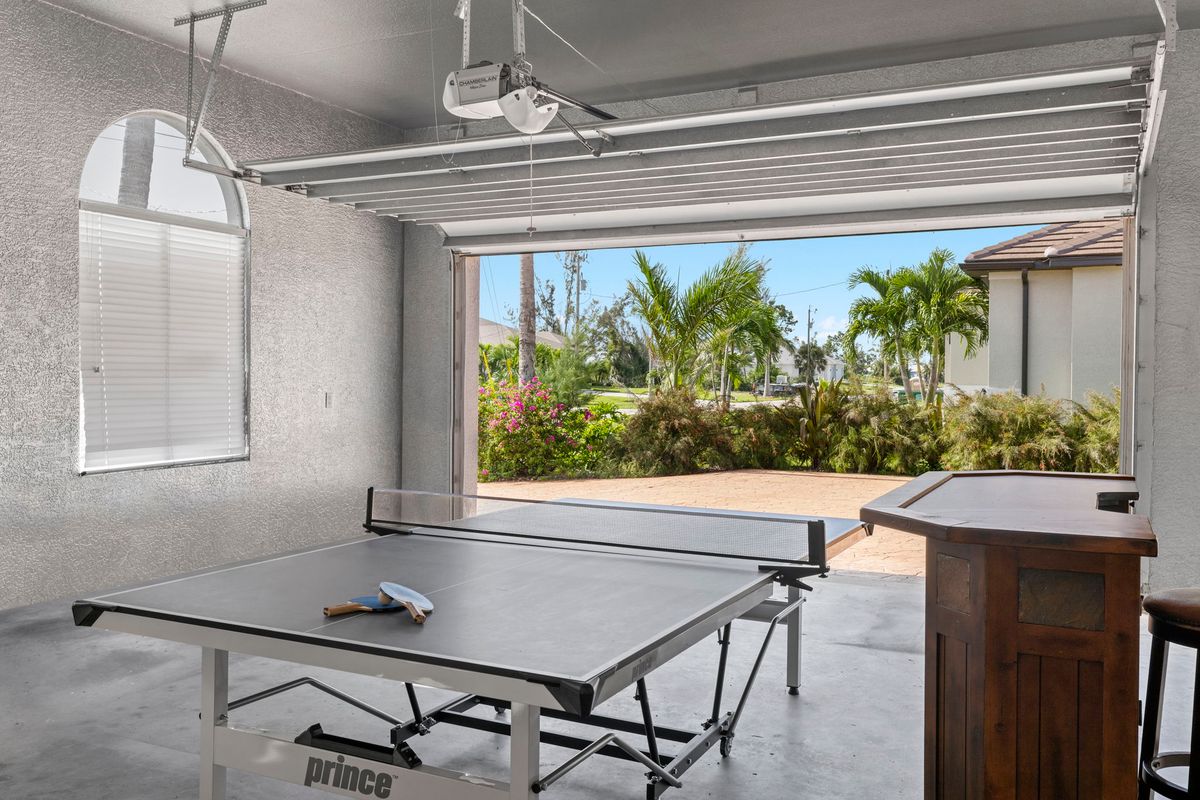 Designed with light and space in mind, the villa's open-plan interiors maximize water views. The fully equipped kitchen boasts marble countertops, modern appliances, and a large dining table that makes every meal a shared experience. After dinner, head to the garage for a friendly ping pong or foosball match, curl up with a book, or stream a movie in the living area. With air conditioning, Wi-Fi, and a washer/dryer, the home balances luxury with convenience for both short and long stays.